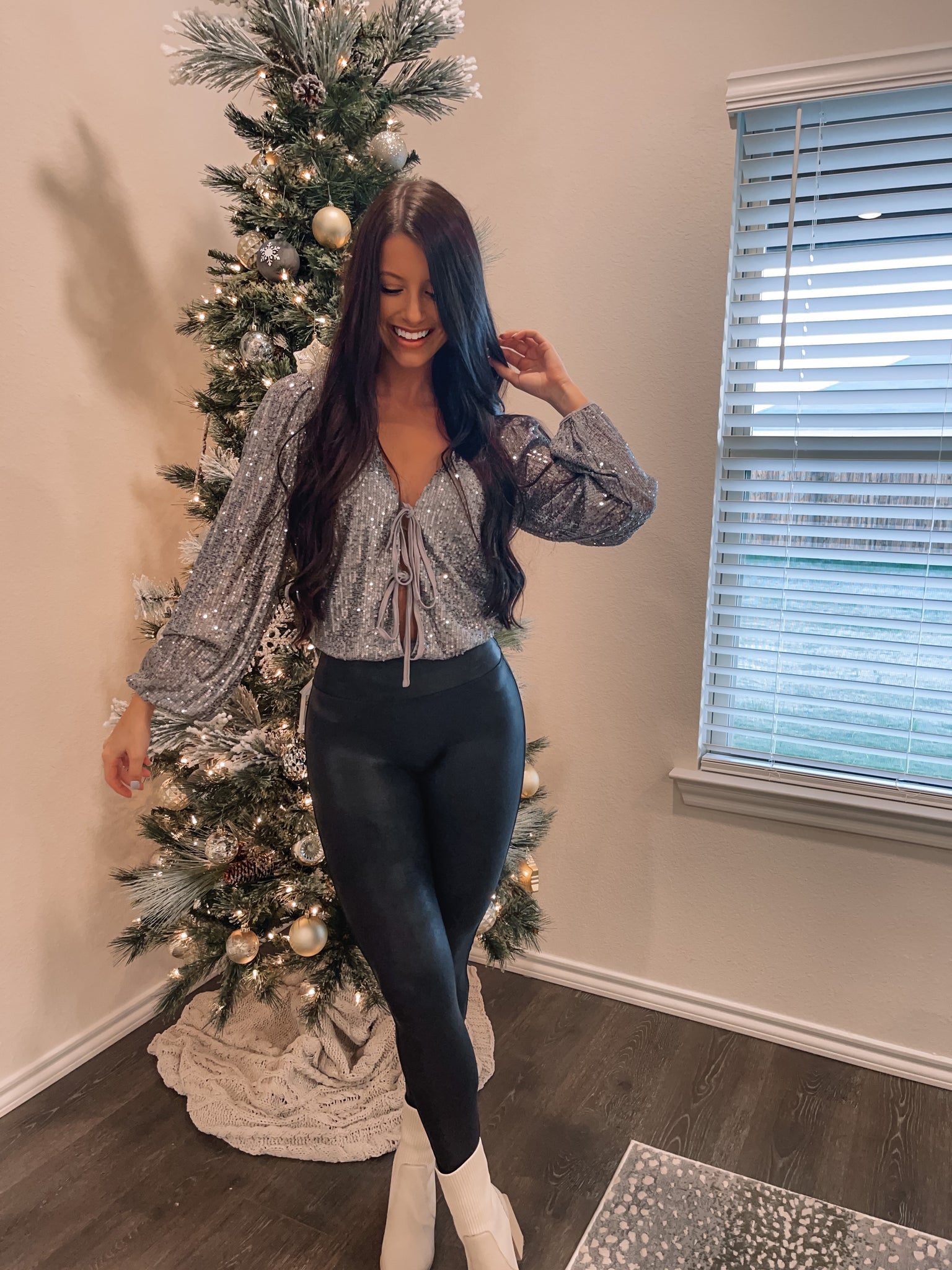 You'll be bringing the sparkle this gorgeous bodysuit! It features a v-neck line, a cut out front with three working ties, slightly padded shoulders, and bell sleeves. The interior of the bodysuit is a satin fabric to ensure it isn't itchy. Pair it with black pants or a skirt and heels for the cutest look!