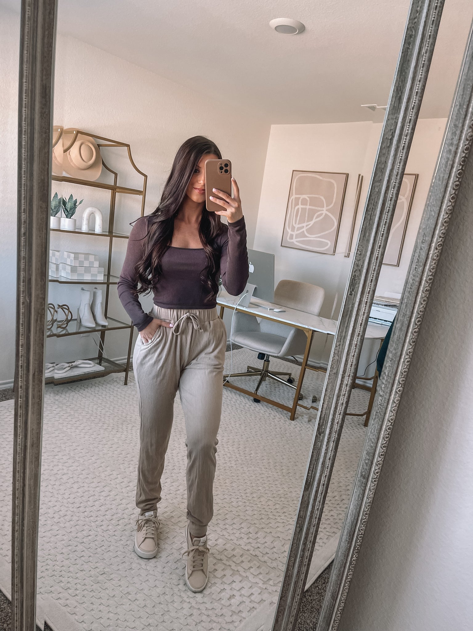 We''l be calling in cozy every day in these joggers! They are high waisted, have an adjustable waist tie, working pockets, and are a soft brushed ribbed fabric!