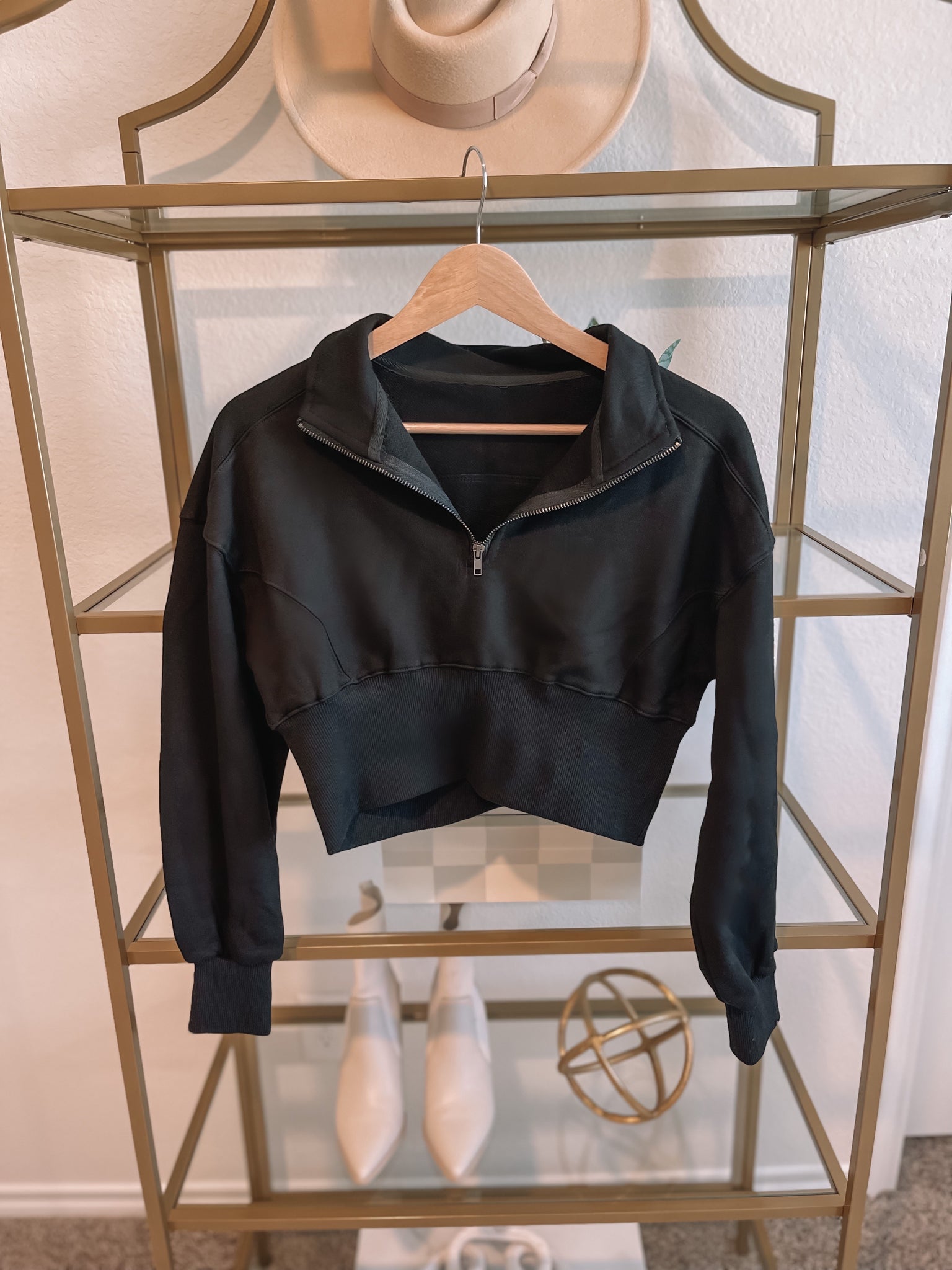 Get ready to chill all season long in this must have pullover! It features a collared neckline, a working half zipper, an elastic waist, and a slightly cropped fit! Pair it with leggings and sneakers for the coziest look!