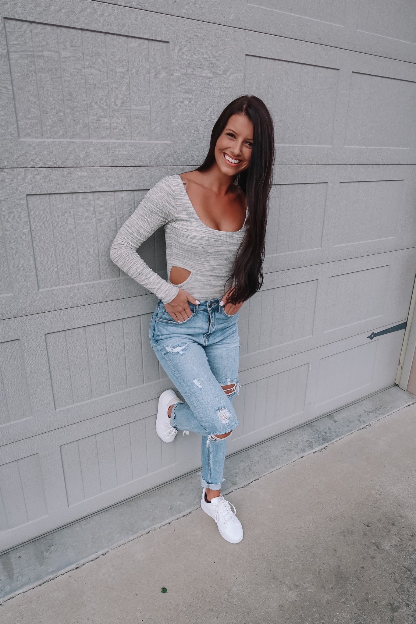 Keeping it hot all season long in this fun little bodysuit! It features a scoop neckline, long sleeves, and cut out detailing below the chest! Pair it with denim and sneakers for the cutest everyday look!