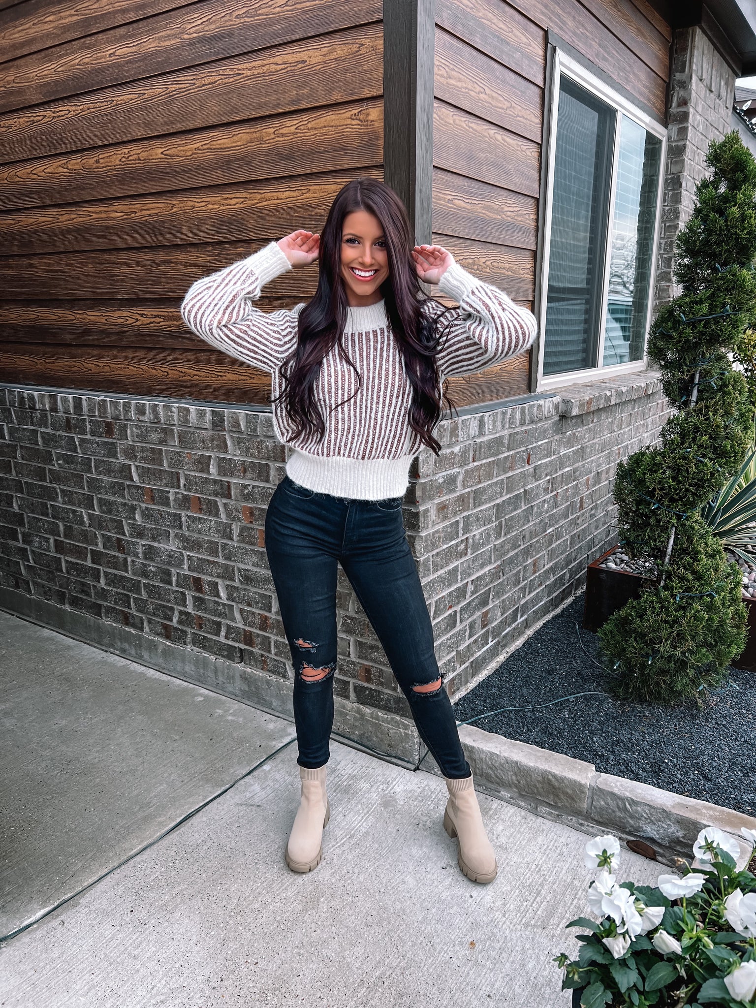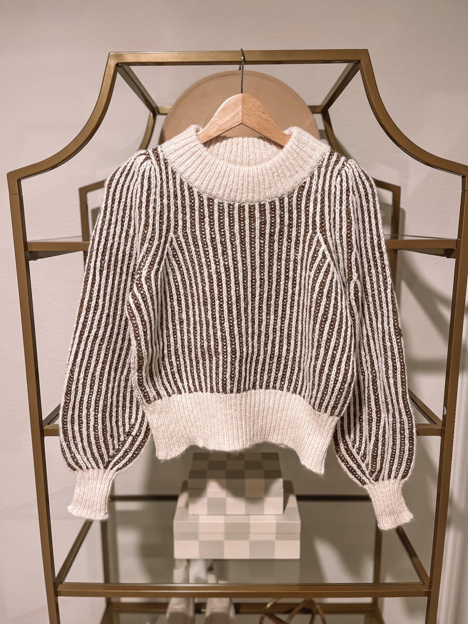 You'll be falling for stripes in this adorable sweater! It features a mock neckline, long balloon sleeves, cinched wrist cuffs, and a bottom hem in a neutral striped pattern!