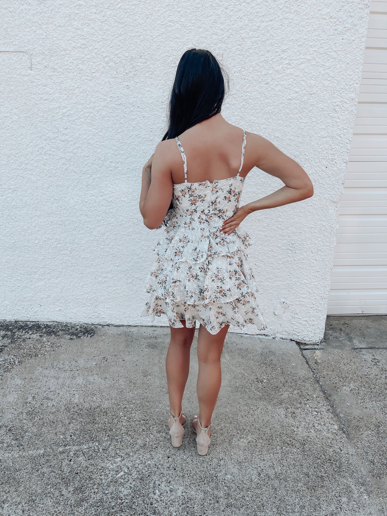 - You NEED this adorable dress for your next event! It is a beige, floral print dress with eyelet detailing throughout and a fun, layered bodice! It features a clasp, front tie closure, and adjustable straps.