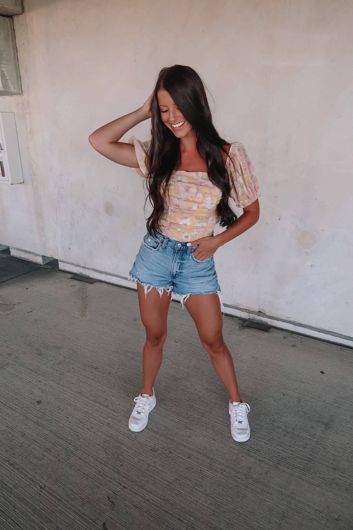 Floral bodysuits are a Summer must have! This beauty is yellow and features pink and white floral detailing, a square neckline, slightly puffed sleeves that can be worn on or off the shoulder, and a rushed bodice. Pair it with your favorite denims and sandals for the sweetest look!