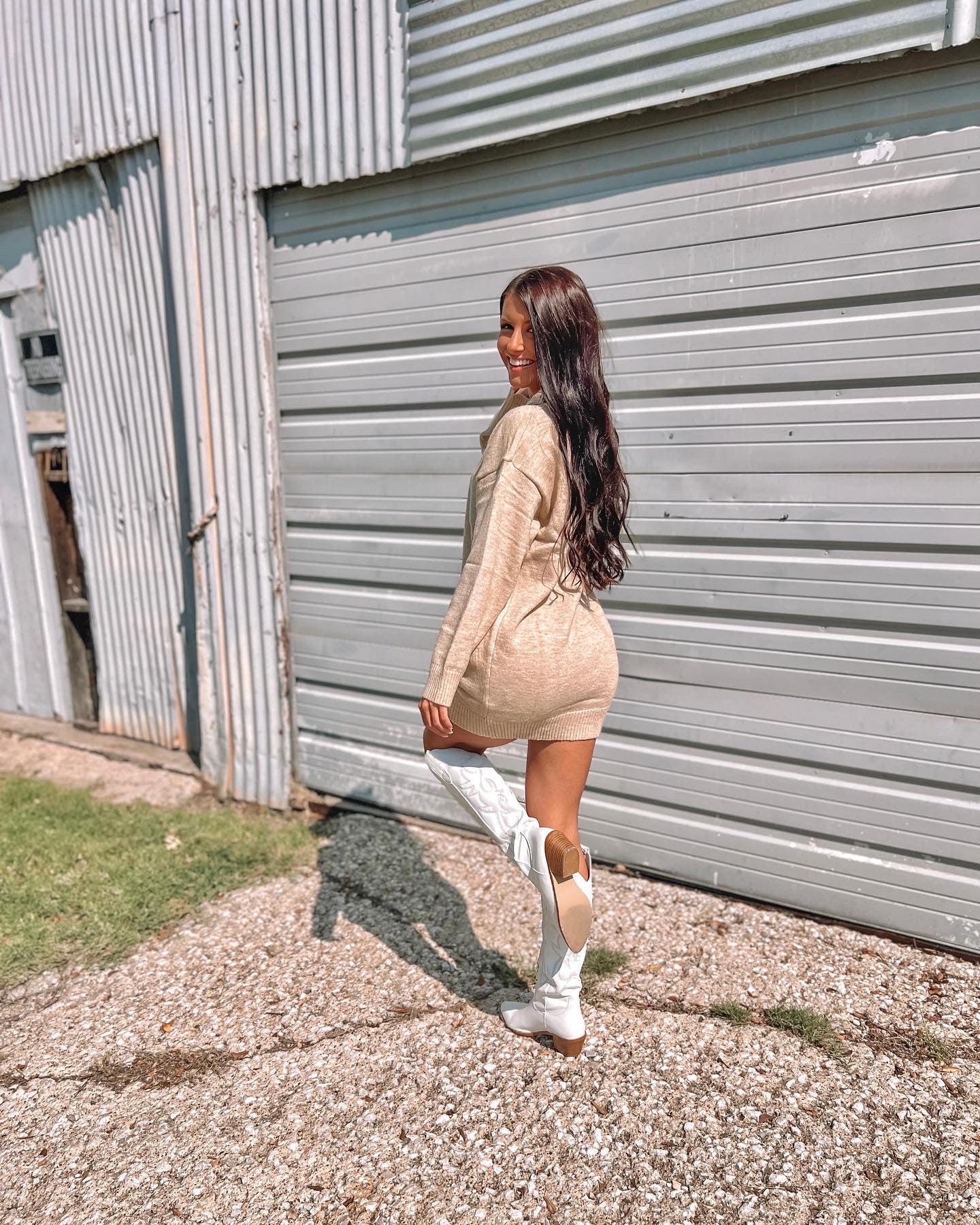 We have found your new favorite sweater dress! It features a half zip up front with a collar, wide arms, pockets, and a ribbed band on the wrists and bottom! Wear it casual with sneakers or dress it up with booties!