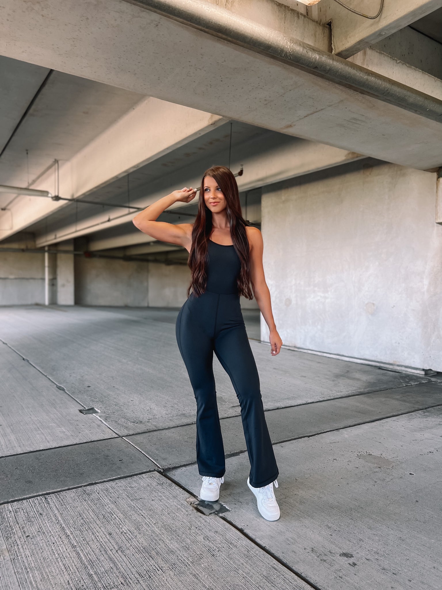 This sleeveless jumpsuit features adjustable straps for support, full built in bra, smooth flat lock seams, and full length flare pants! Wear it to hangout or on the go!