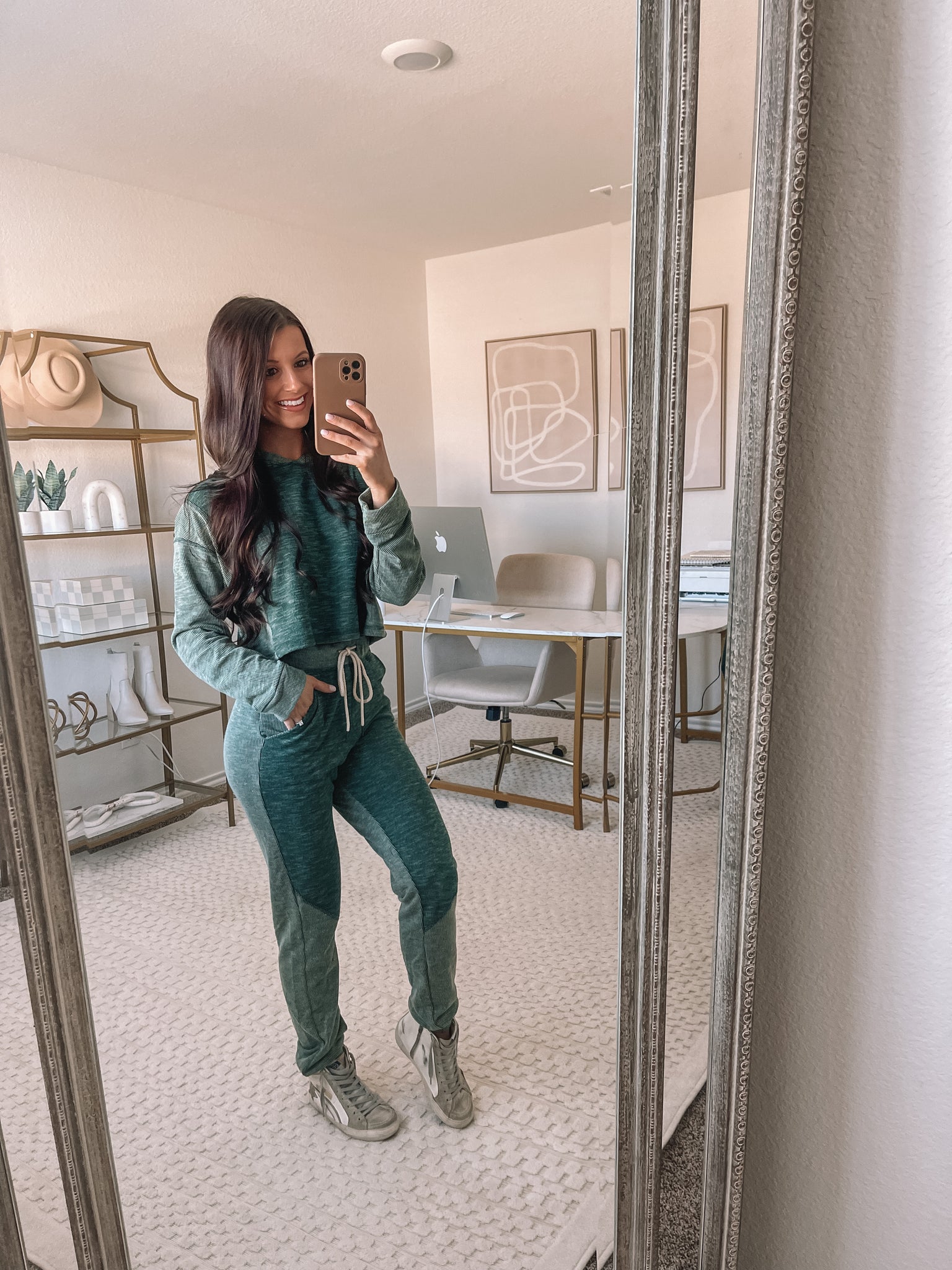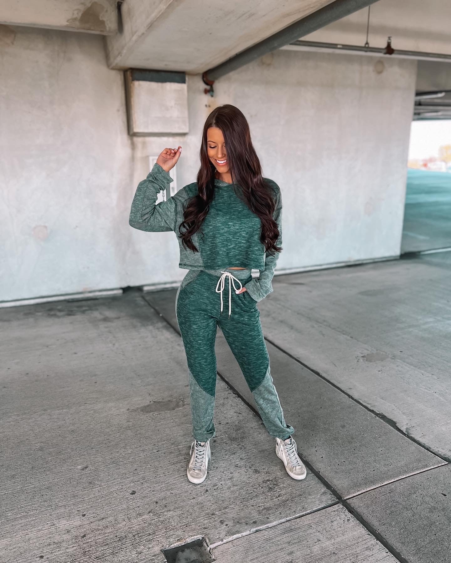 We are obsessed with this unique set! The top features long sleeves, a hoodie, and a slightly cropped waist. The bottoms features a high waist fit, and adjustable waist tie, working pockets, and the coziest fabric in hunter green!