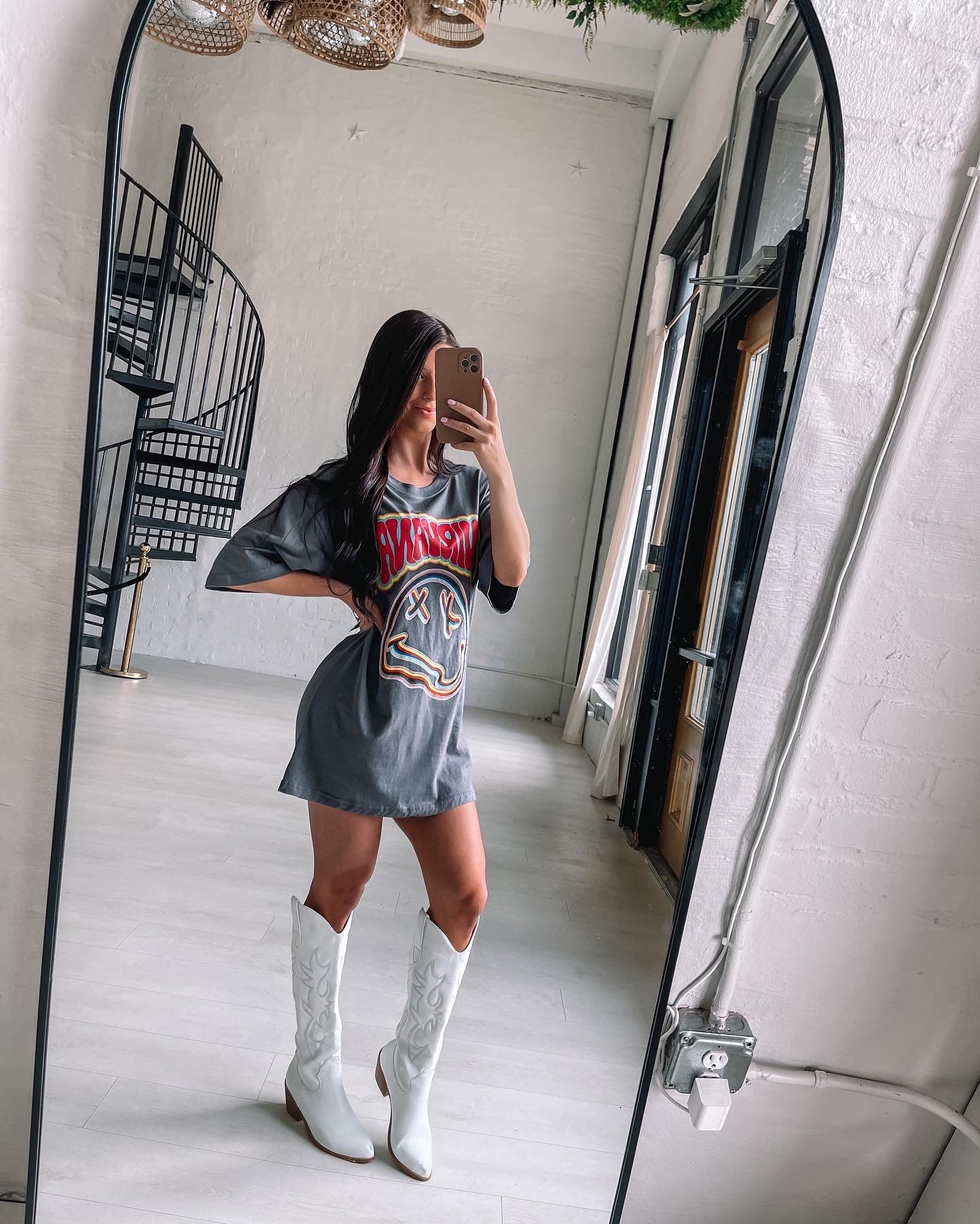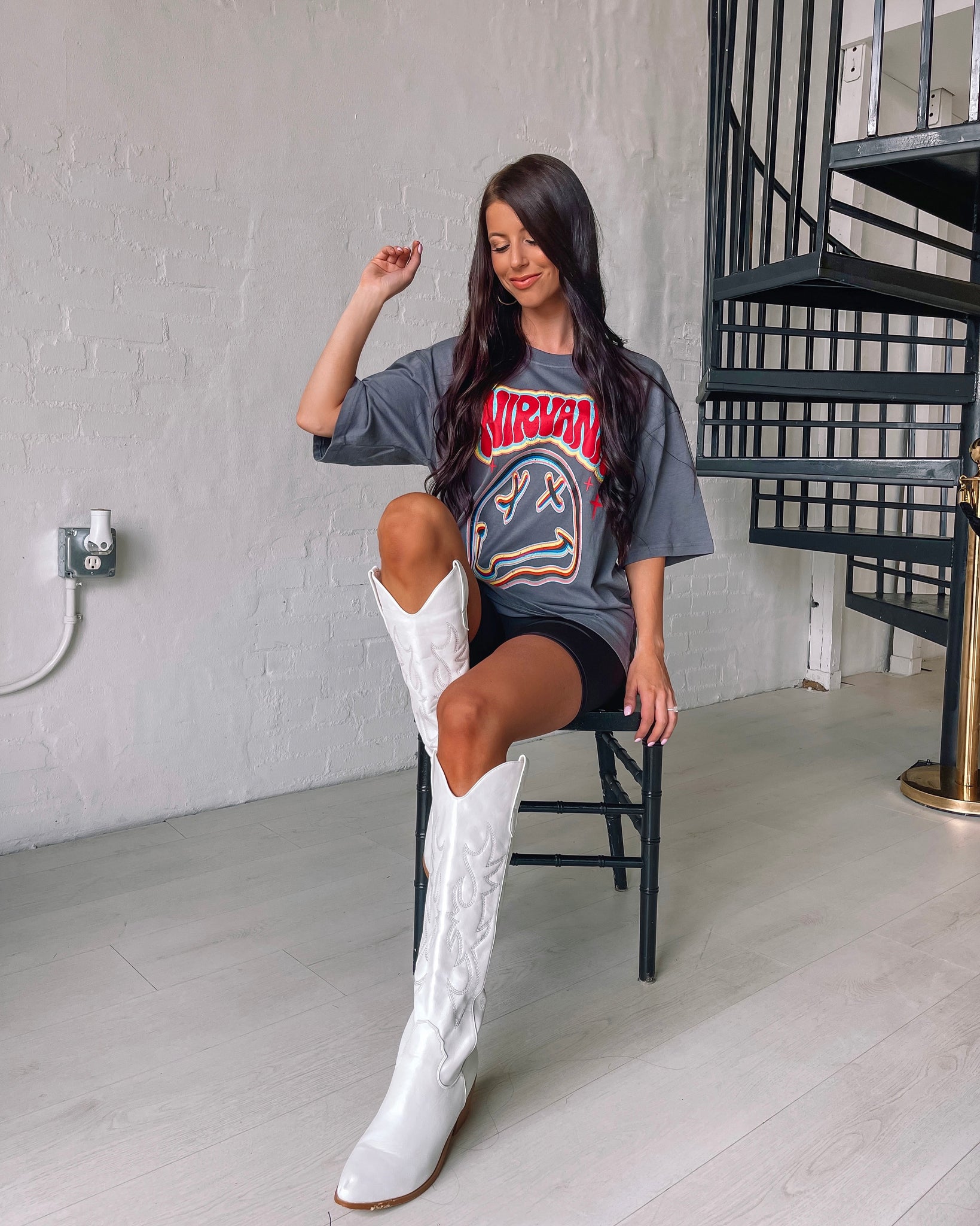 Because you can never have too many oversized tees! This graphic tee features "Nirvana" in pick, yellow, and blue!