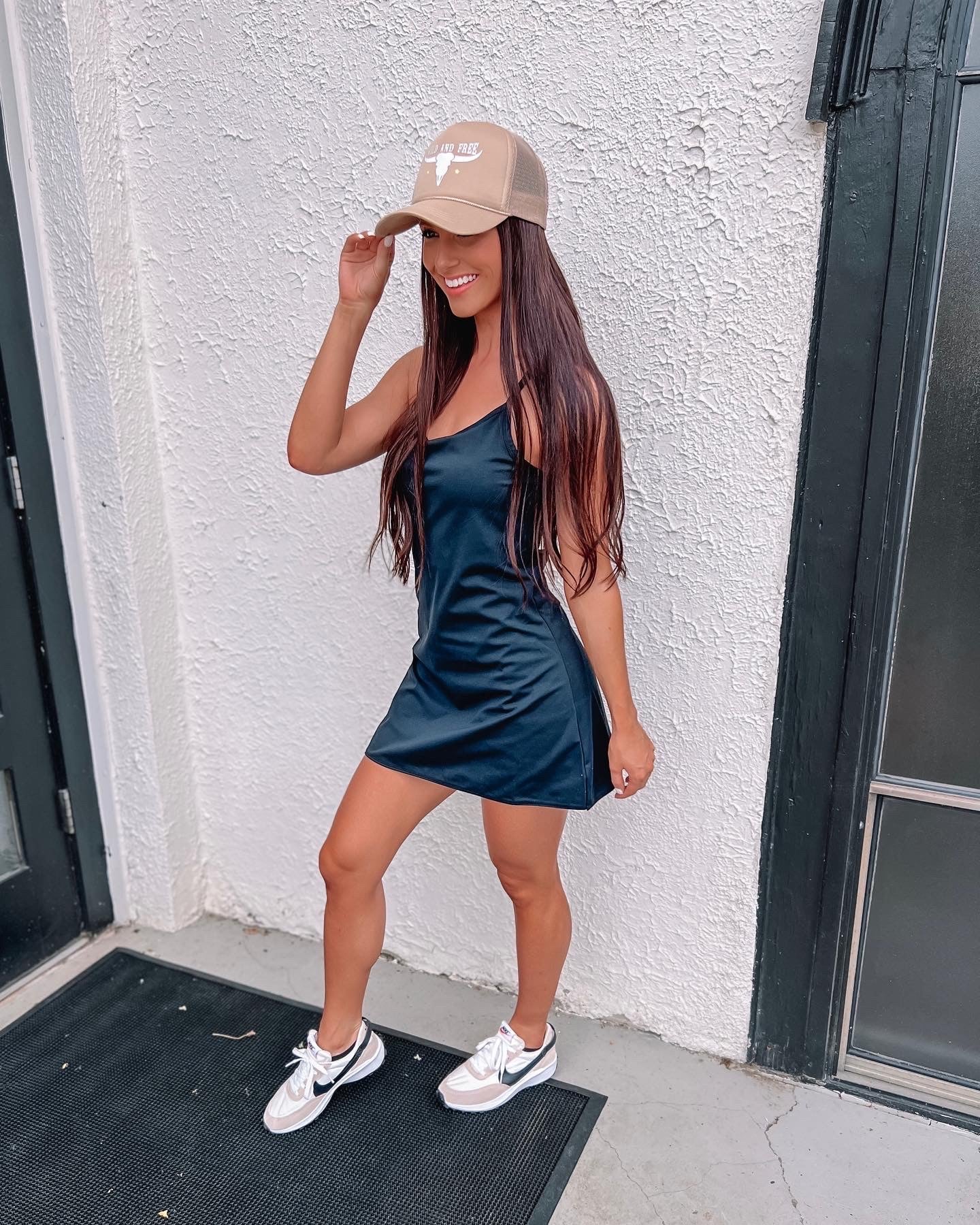 This dress will be your new favorite athletic piece! It features a scoop neckline, removable padding, inside short liners with pockets on the side, and twin racer back adjustable straps for extra breath ability and mobility! Pair it with your favorite sneakers for the cutest look!
