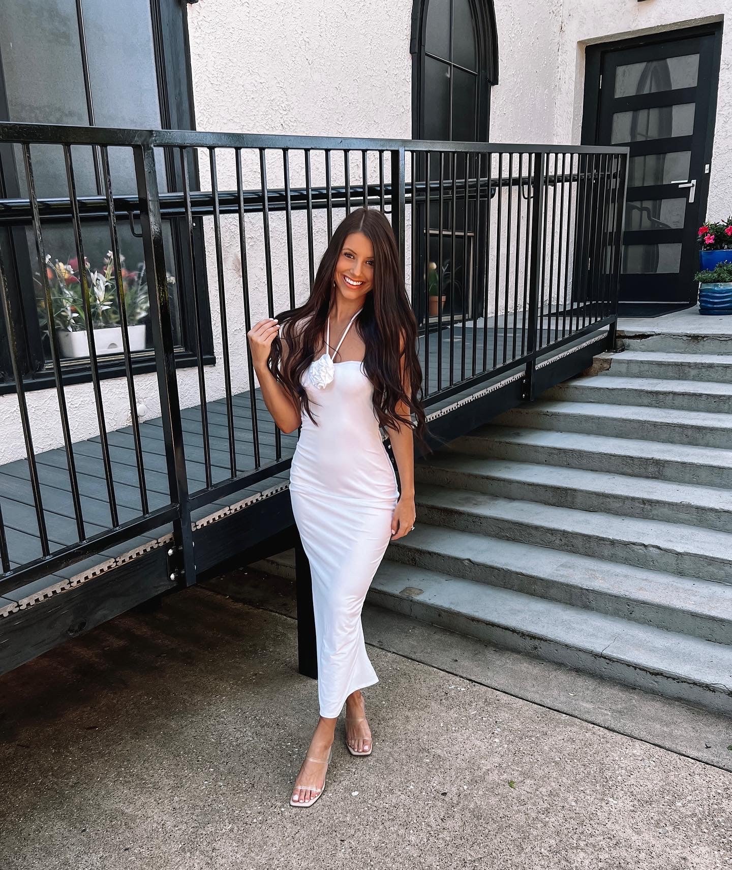 The most stunning dress for your next event! It features a working halter neck tie, a rosette detail, a midi length, a back slit, and a smooth, thick fabric!