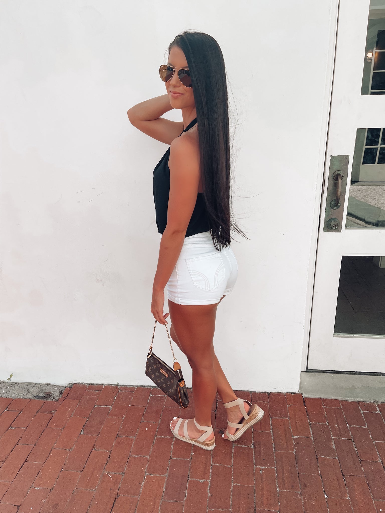 We have found the perfect black bodysuit and you NEED it in your closet! It features a halter neckline with a tie and is a gorgeous silk material! Pair it with white shorts for the cutest look!