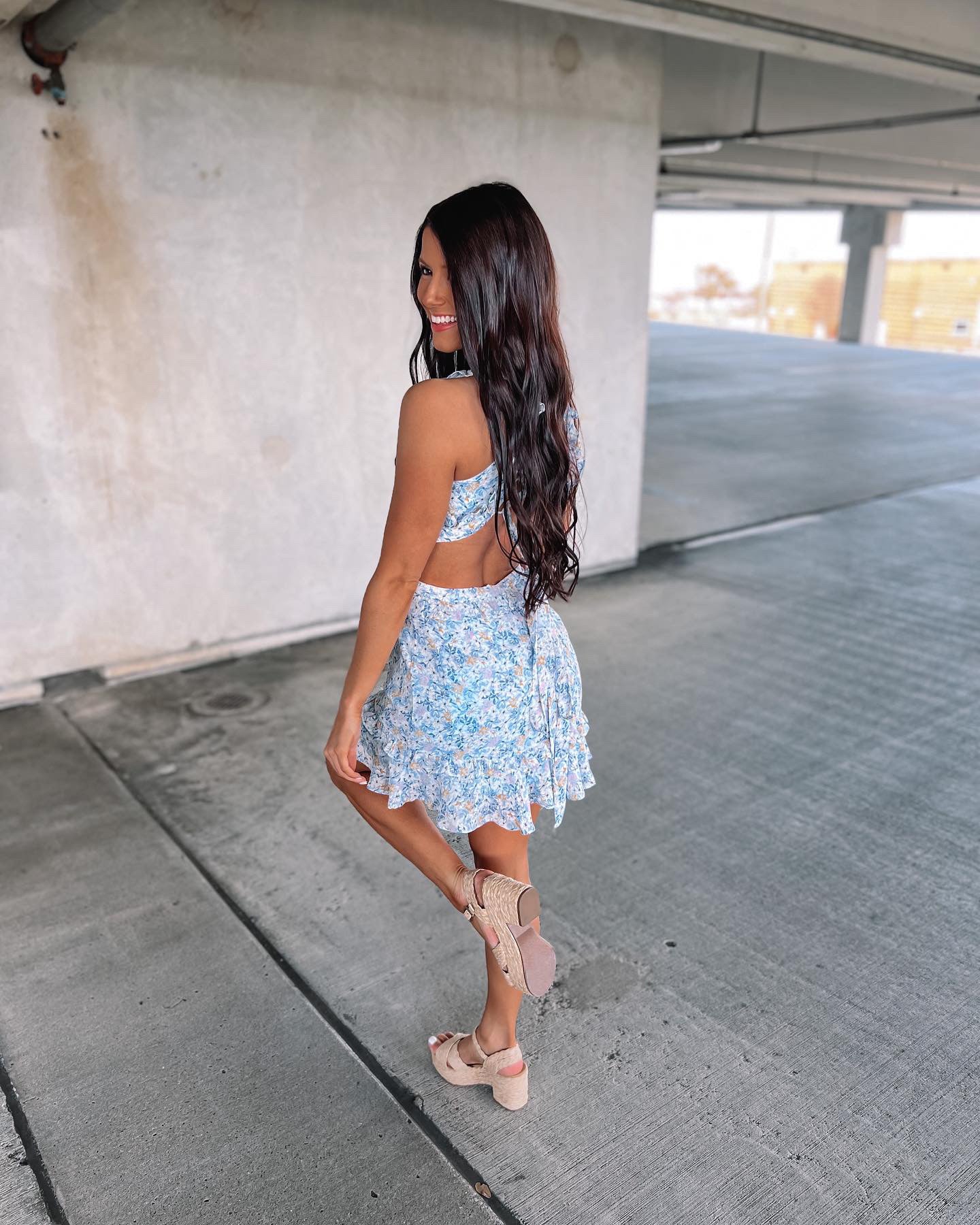 The sweetest, little dress for your next occasion! It features a v-neckline, sleeveless shoulder straps, a ruffled waist, and a back lace up detail with a working tie in a blue, floral print!