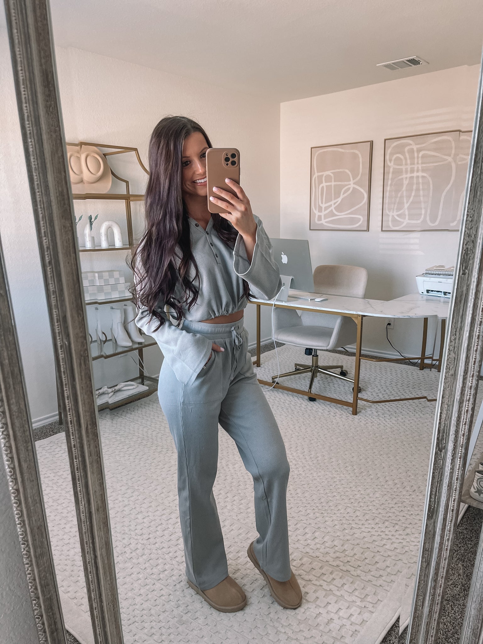 Who says you can't be cute and comfortable whether you're staying in or on the go?! Our newest favorite set features a cropped pullover with a hoodie, working buttons, an adjustable waist tie, and bell sleeves. The bottoms feature a high waist fit with working pockets, an adjustable waist tie, and a wide leg fit with a waffle material throughout.
