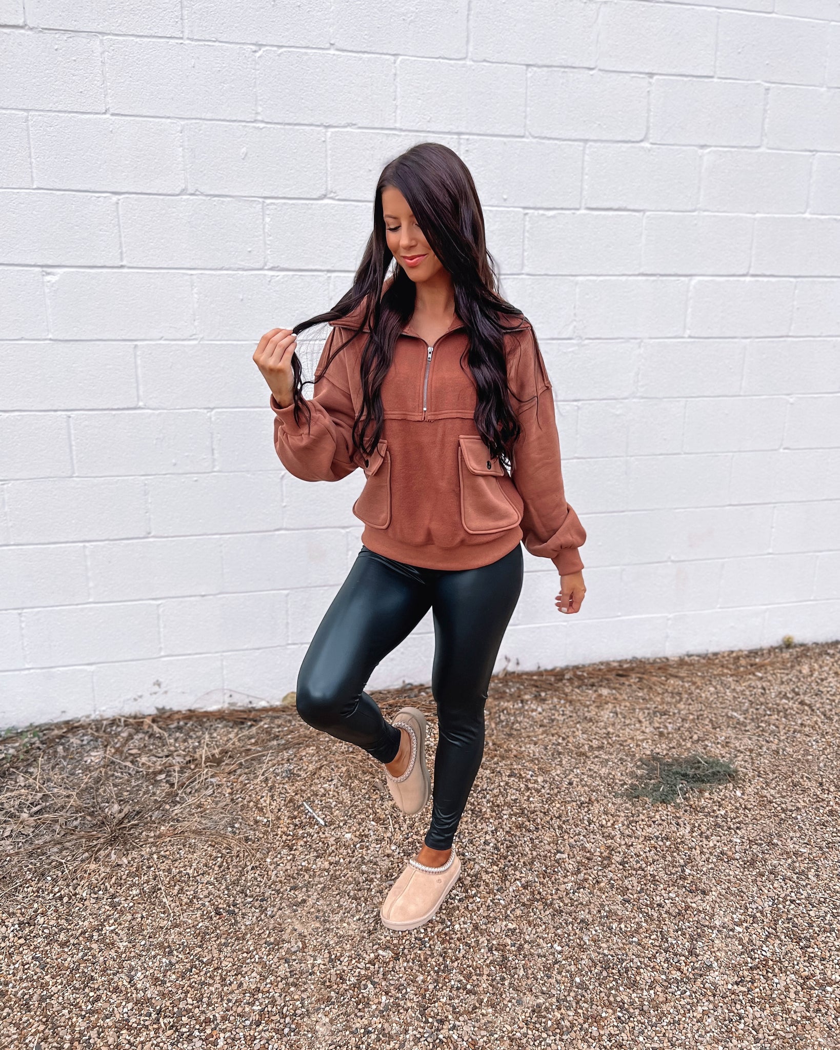 Did someone day leather weather? We got you! These gorgeous leggings are the perfect staple piece all season long. They feature a thick high waist band with fitted legs and a great length making them perfect worn with booties or sneakers!